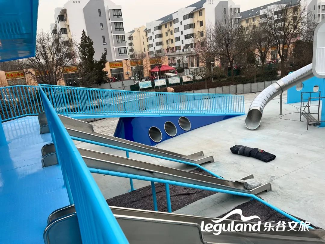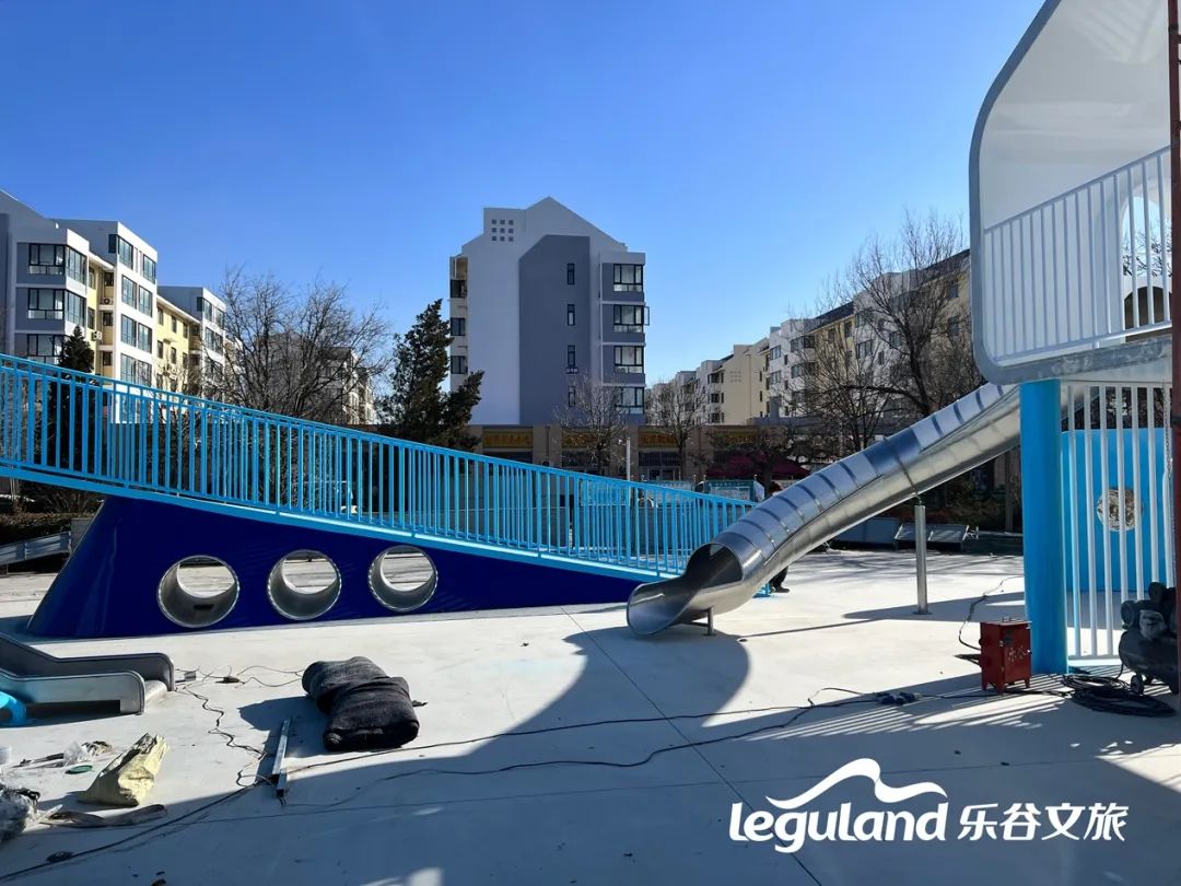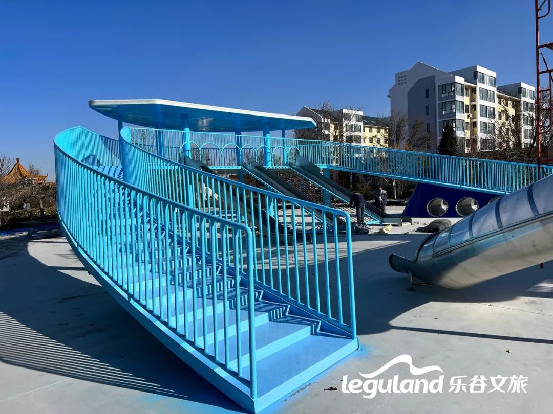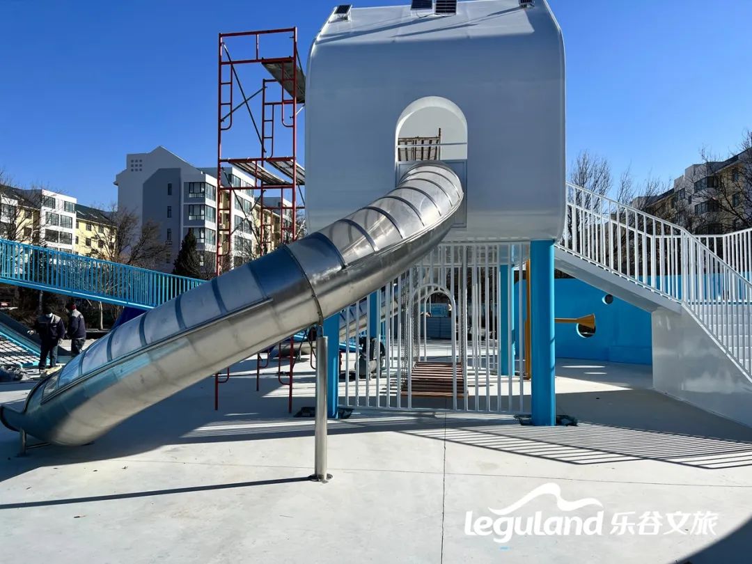 孩子们可以通过楼梯爬上看台从两侧的滑梯滑下