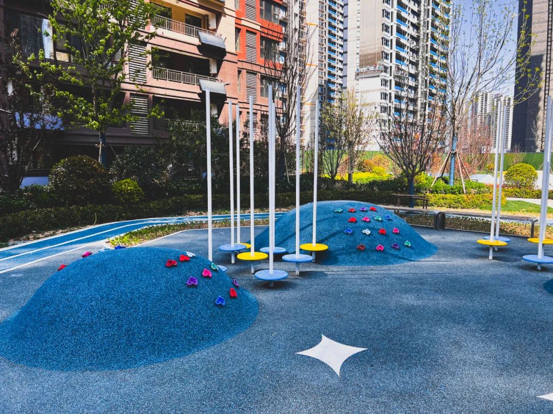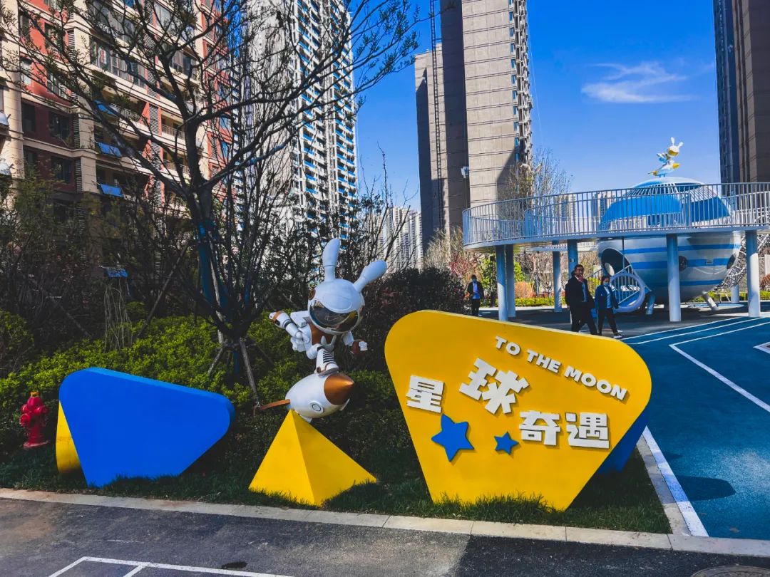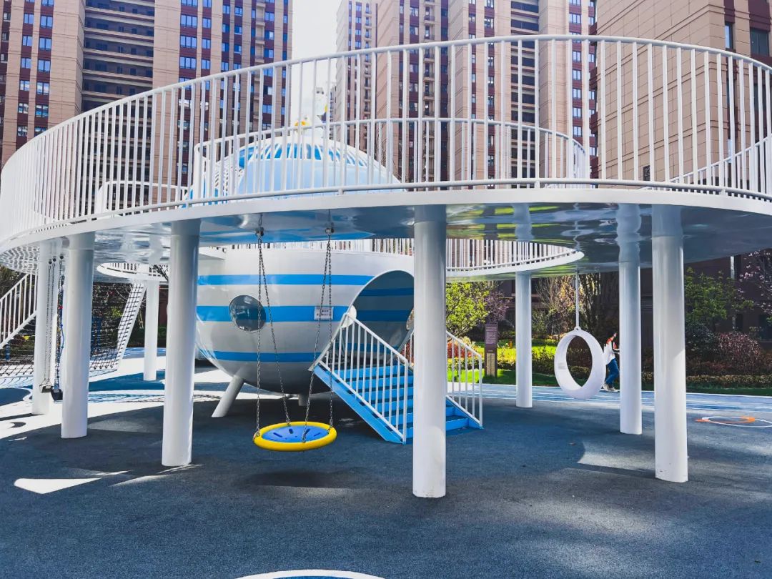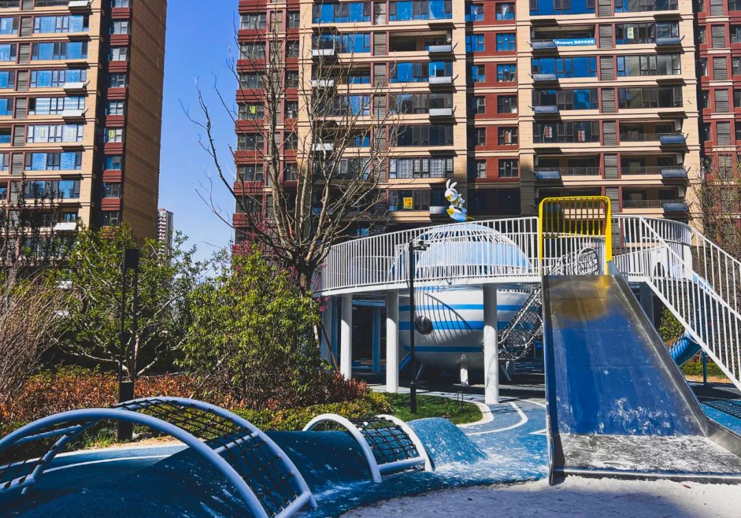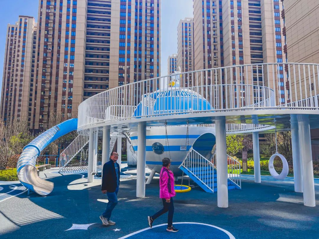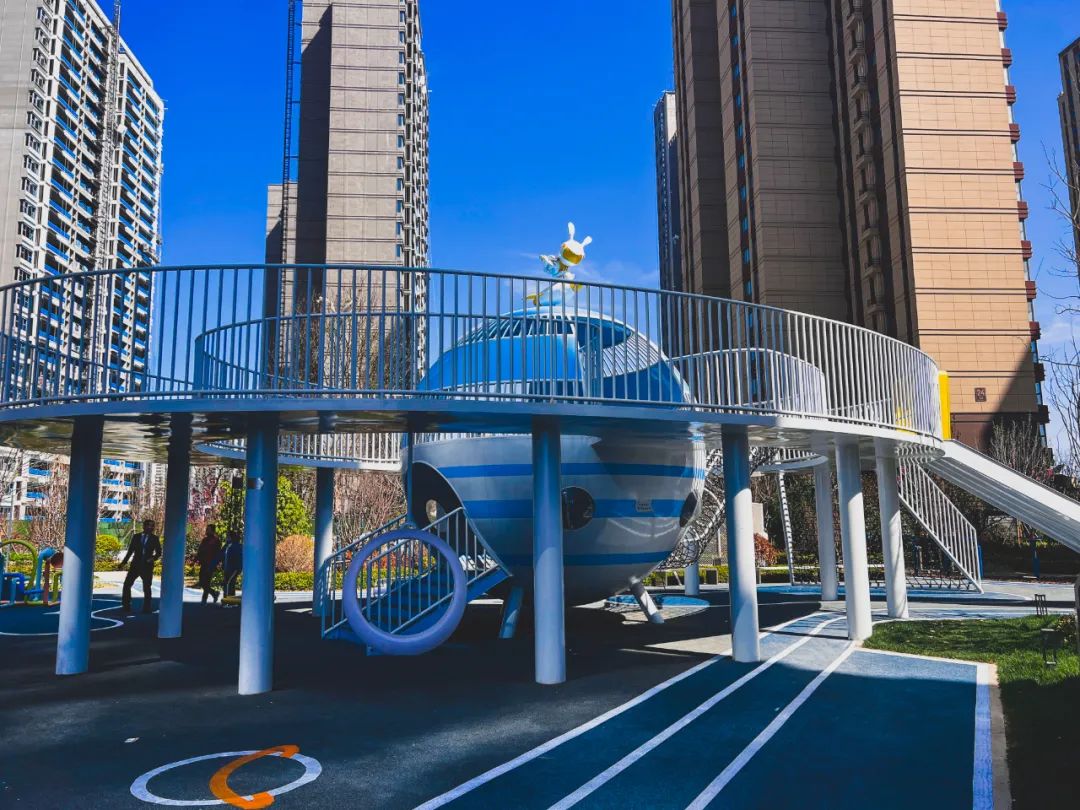 在烟台鲁商金茂观海印象的小区内,有一座无动力儿童乐园,名为“星球奇遇”。这个乐园以星球为主题,结合了游乐设施、户外攀爬网、冒险行走装置、多人传声筒、摇摇椅、复古水井、儿童篮球场、轮滑园等多种设备,为孩子们提供了一个充满探险与挑战的游玩天地。