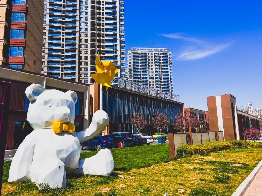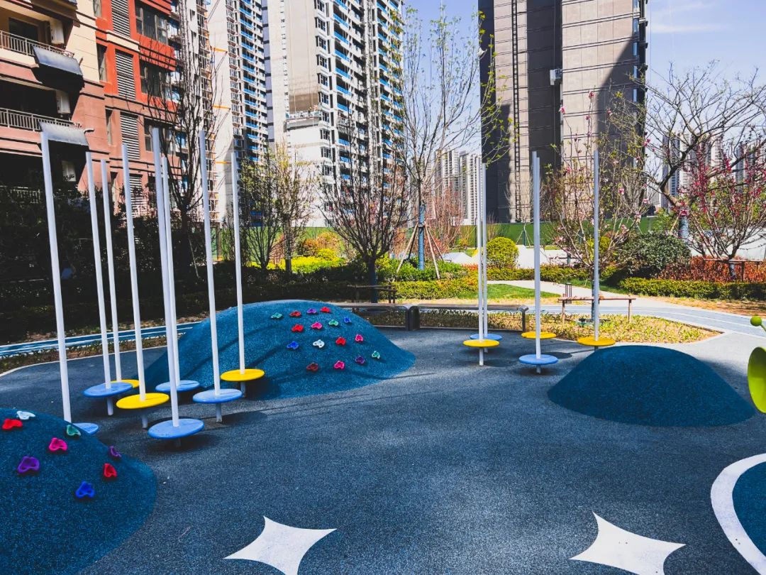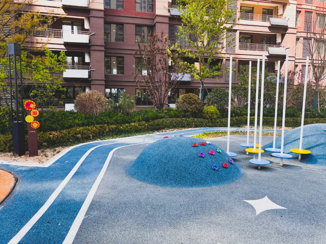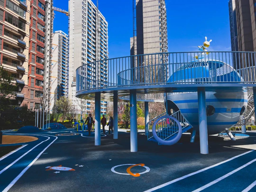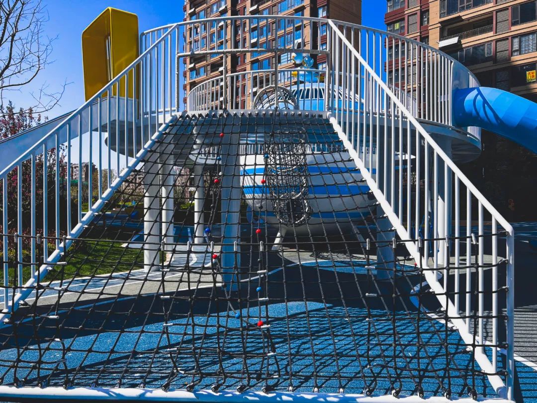 在烟台鲁商金茂观海印象的小区内,有一座无动力儿童乐园,名为“星球奇遇”。这个乐园以星球为主题,结合了游乐设施、户外攀爬网、冒险行走装置、多人传声筒、摇摇椅、复古水井、儿童篮球场、轮滑园等多种设备,为孩子们提供了一个充满探险与挑战的游玩天地。
