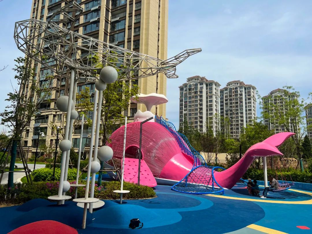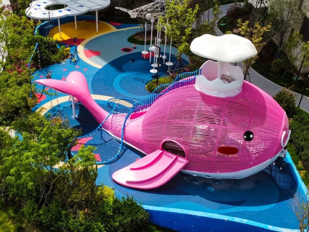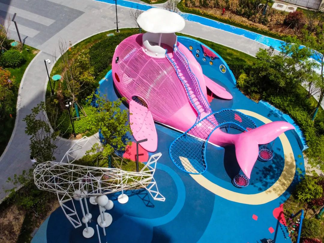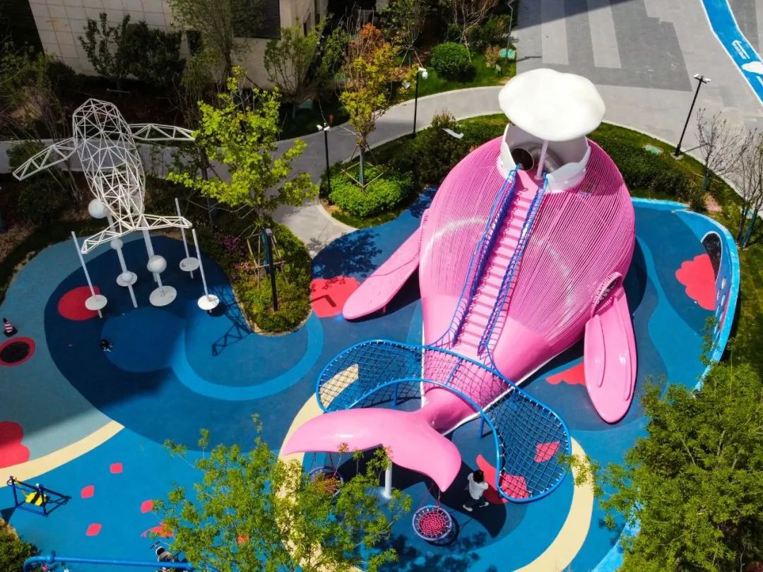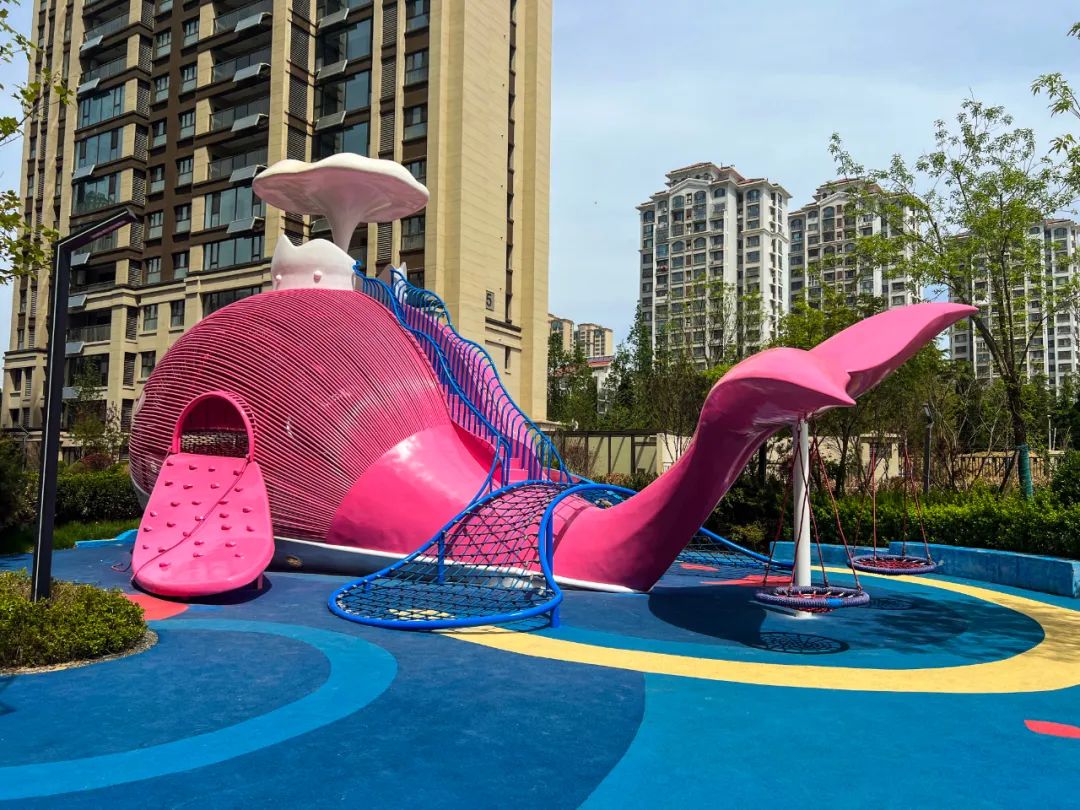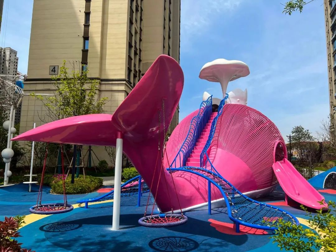 首先,我们为孩子们设计了两个秋千和一个大型爬网分别安装在了粉色鲸鱼的尾鳍和背鳍。这些设施不仅能够满足孩子们的攀爬需求,还能提供足够的空间让他们在秋千上享受荡漾的快乐。