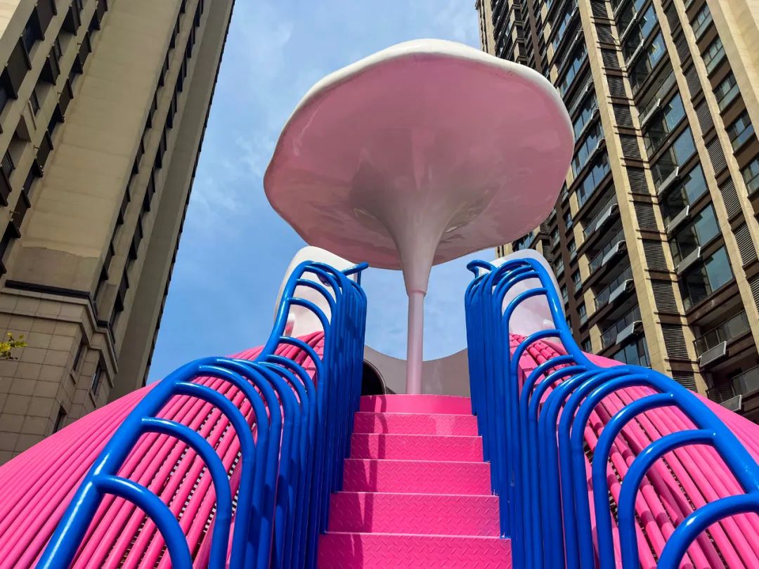 而在粉色鲸鱼一侧,是一张张印有鲸鱼图案的休息室。在这里,他们可以暂时停下脚步,欣赏粉色海洋世界的美丽景色,也可以去墙面进行绘画。