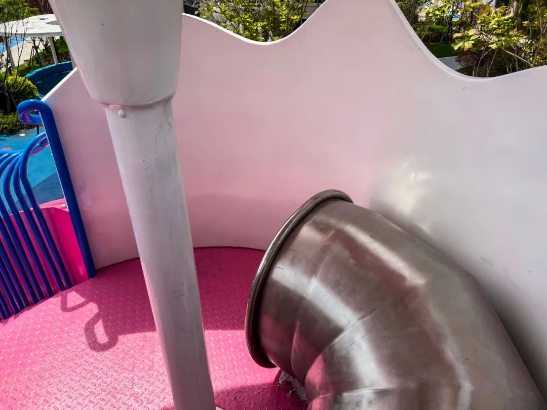 进气孔的入口是大型不锈钢滑梯,从滑梯滑下可以滑到鲸鱼肚子内。
